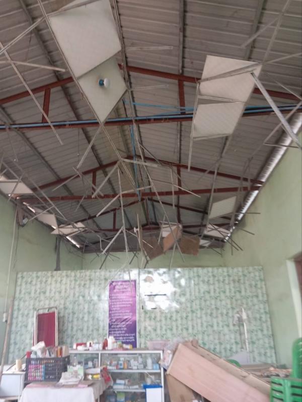 落下した天井や医療器具が散乱するマンダレーの診療所=岡田茂理事長提供