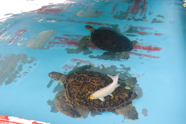ウミガメとニシキゴイが一緒に泳ぐ様子を見守る(左から)島袋さんと理大生物科学科の山本俊政准教授