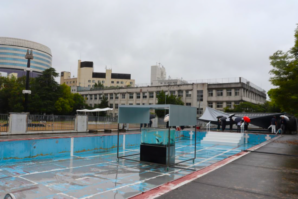 9月26日に岡山市で開幕した国際的現代美術展「岡山芸術交流2025」。その出展作品の一つに岡山理科大学が開発した好適環境水を旧内山下小学校のプールに満たし、アオウミガメとニシキゴイを共生させるアート作品が出現しました。海水魚と淡水魚が同居できる好適環境水の特性を活かし、自然界ではあり得ない組み合わせと小学校のプールで海の生き物に出会うという作品です。