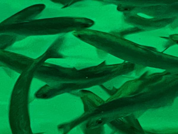 好適環境水の水槽の中を元気よく泳ぎ回るベニザケの幼魚